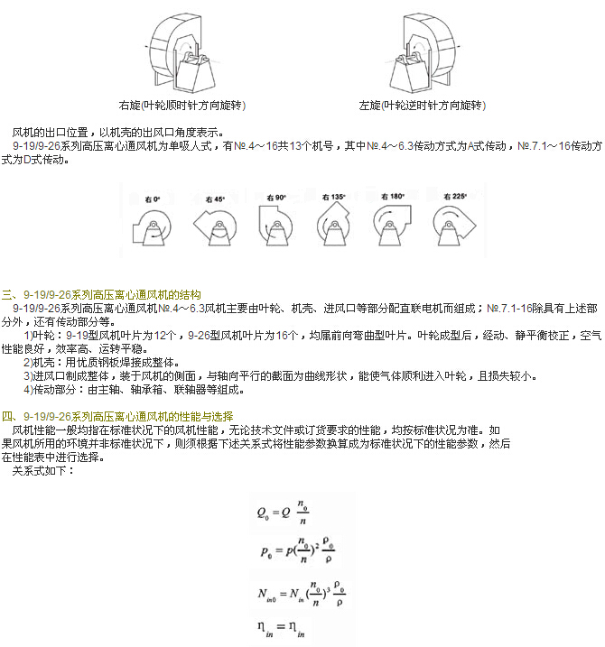 9-19/9-26系列高壓離心通風機可制成右旋轉和左旋轉兩種型式。從電動機一側正視,葉輪順時針旋專,稱為右旋風機,以“右’’表示;葉輪逆時針旋轉,稱為左旋風機,以“左”表示。