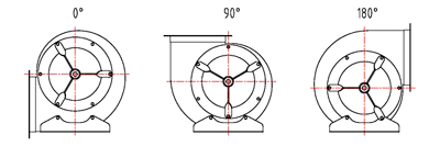 ADF系列外轉子風機制成整體結構,風機可分為左旋和右旋兩種,即從電機出線一側正視,葉輪逆時針旋轉稱為左旋,葉輪順時針旋轉稱為右旋。用戶訂貨時須注明風機旋向。ADF系列外轉子風機可制成0°、90°、180°三種常規(guī)角度(如下圖所示),也可按客戶要求制成任何安裝角度。
